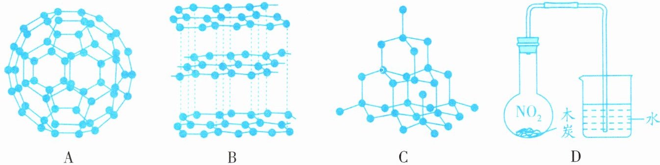 (3)图D中向盛有红棕色$NO_2$气体的烧瓶中投入若干块木炭,连接好装置,稍待片刻,能看到烧瓶内红棕色变浅。从微观结构上分析,木炭具有______的结构,具有吸附性。除了气体颜色的变化,还可能观察到的现象为______。
