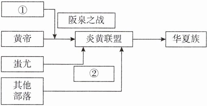 (2)①炎帝;②涿鹿之战。特点:由多个部落联盟融合而成。