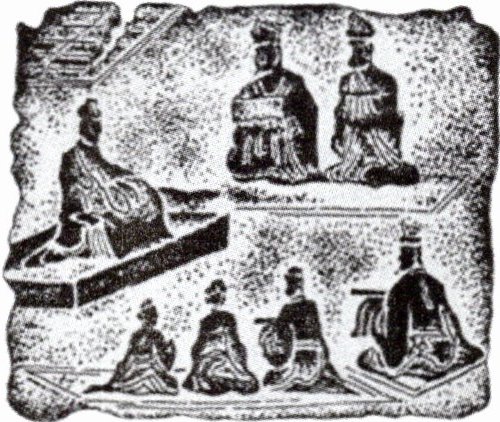 4. 右图是《汉代讲经图》(汉代画像砖),描述了汉代太学里的教学场景。图中经师使用的教材最有可能是( )