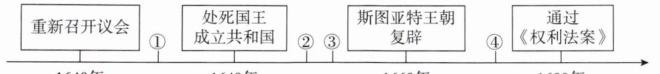 【解析】:本题主要考查英国资产阶级革命中“光荣革命”的时间及对相关历史时序的掌握。英国资产阶级革命过程中,1640年议会重新召开标志着革命开始;之后经历了处死国王成立共和国、斯图亚特王朝复辟等阶段;1688年“光荣革命”发生,1689年通过《权利法案》。我们需要根据这些历史事件的时间顺序,判断“光荣革命”在给定时间轴中的位置。
