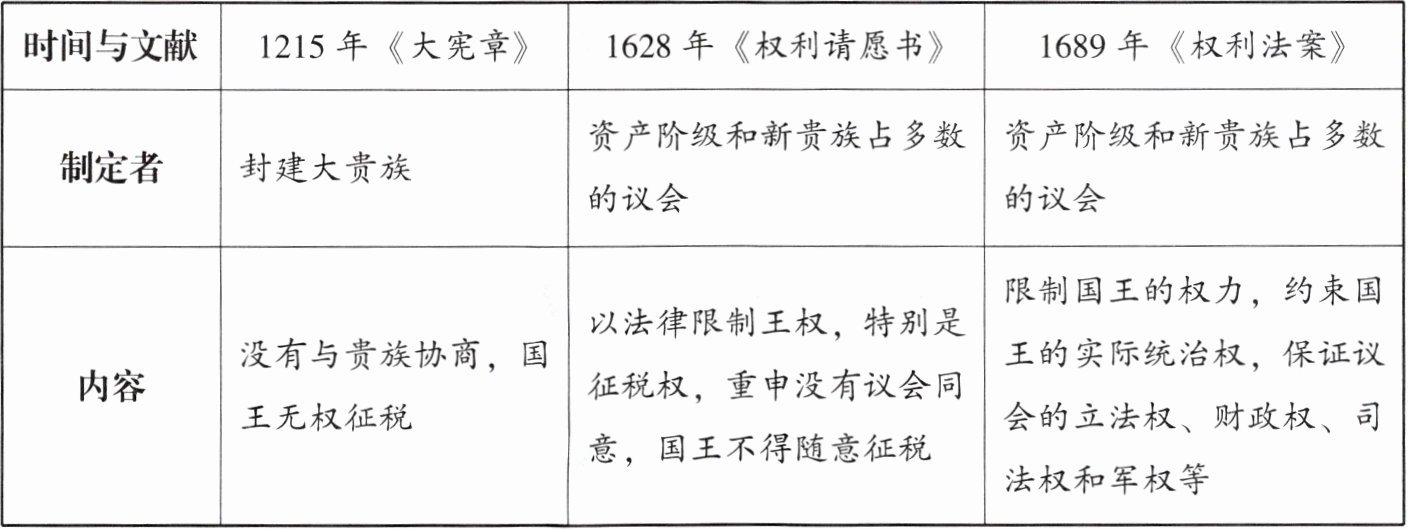 【解析】:本题可根据表格中不同时间文献的制定者及内容,分析英国民主政治建立过程的特点。