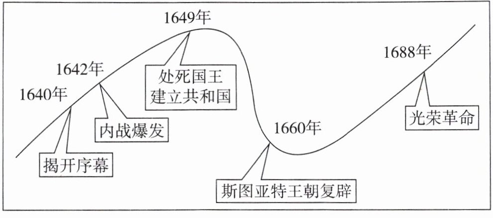 (1)本题第一问考查英国资产阶级革命的特点,从图中可以看出革命历程的曲折性。第二问考查英国解决王权专制问题的方式,即通过颁布《权利法案》来限制王权,确立君主立宪制。