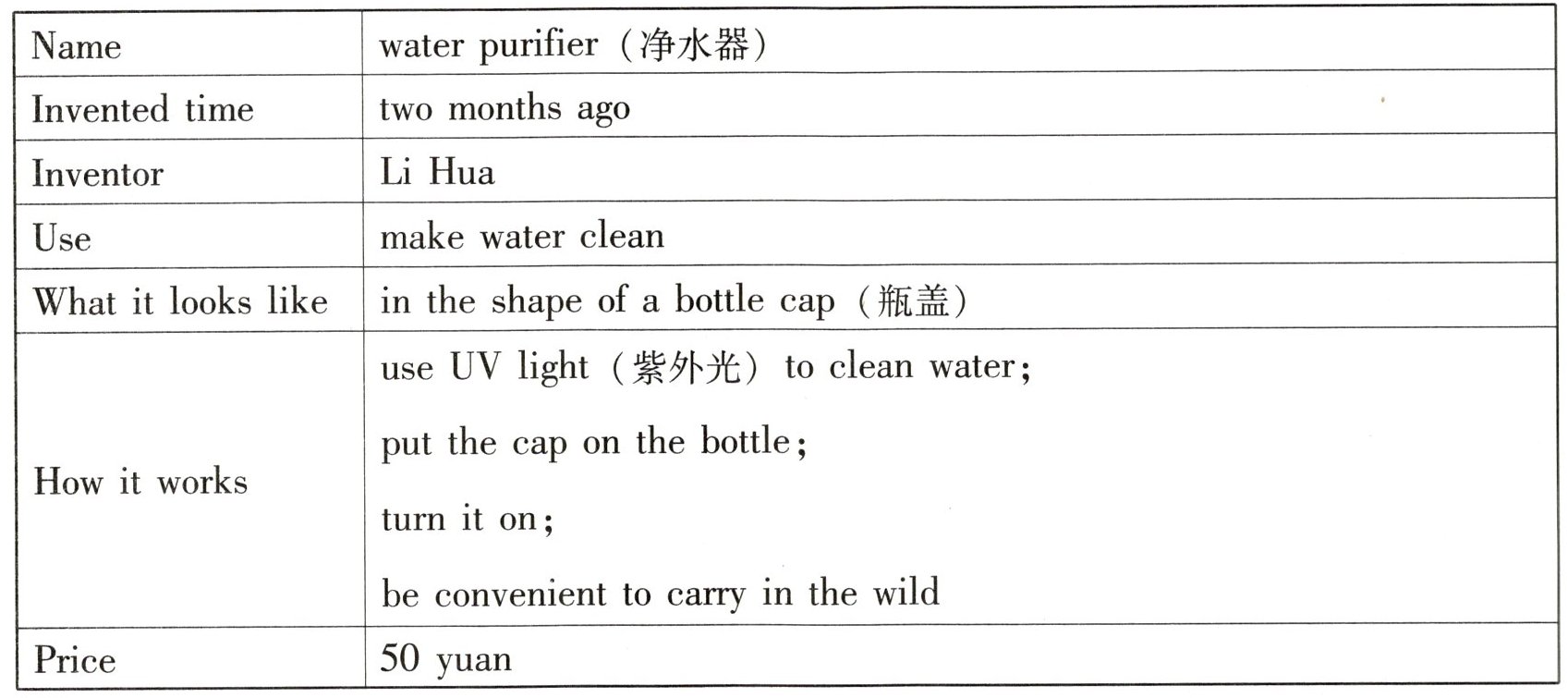 假如你是李华,酷爱发明。你报名参加了国际中学生发明创业大赛,需要向评委们“推销”你的新发明,以下是发明的基本信息。请用英语写一篇短文,为你的发言做准备。