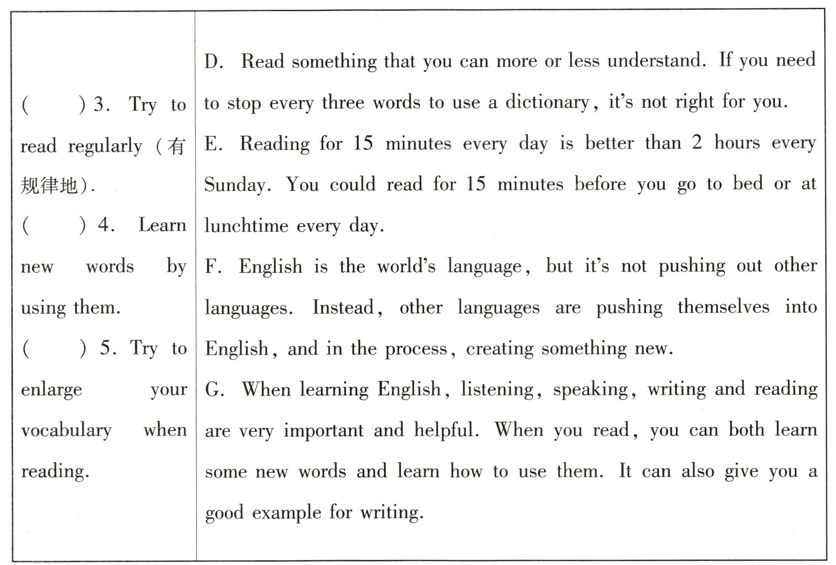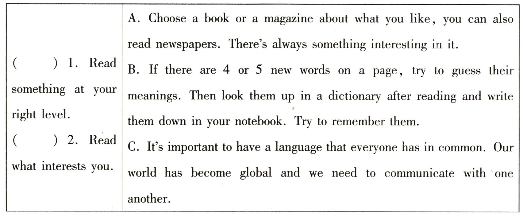 左栏是有关阅读的五个建议,右栏是七则改善阅读方法的介绍,请根据右栏的描述在左栏选择合适的建议。