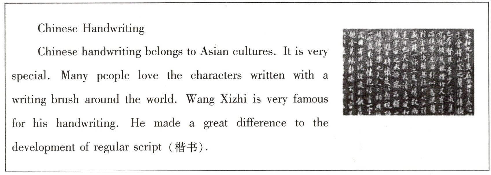 ) 1. Wang Xizhi played an important role in ____.A. Chinese handwriting