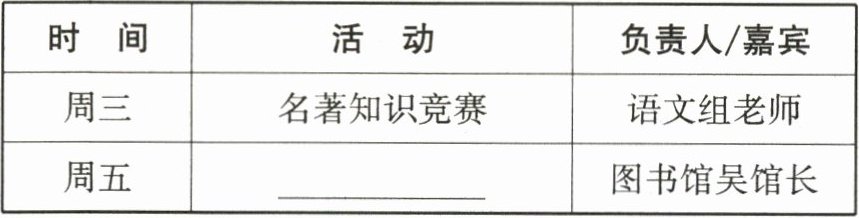 (2)学校拟邀请市图书馆吴馆长作为嘉宾参与这次活动,请你参照示例,完善活动策划单。(1分)