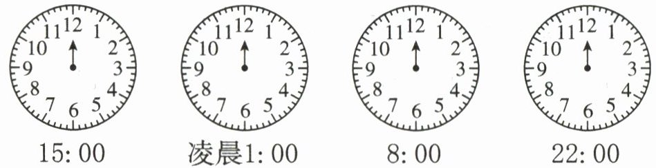 (由于题目要求画图,此处无法直接呈现时针画法,实际作答需在对应的钟面图上画出时针:15:00时针对准3,凌晨1:00时针对准1,8:00时针对准8,22:00时针对准10。)