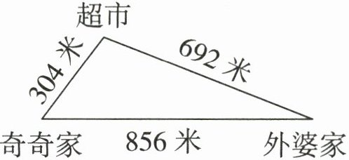 4. 奇奇从家出发,先走到超市,再走到外婆家,这样所用的时间比奇奇从家直接走到外婆家所用的时间多5分钟。奇奇平均每分钟走多少米?(5分)