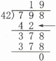 )。$\begin{array}{r} 19\\ 42\enclose{longdiv} {798}\\ 42\\ \hline 378\\ 378\\ \hline 0\end{array} $