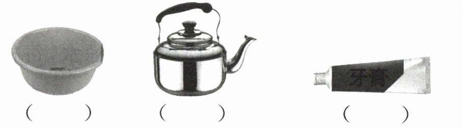 3. 下面的物体中,容量比1升大的在( )里画“○”,容量比1升小的在( )里画“△”。