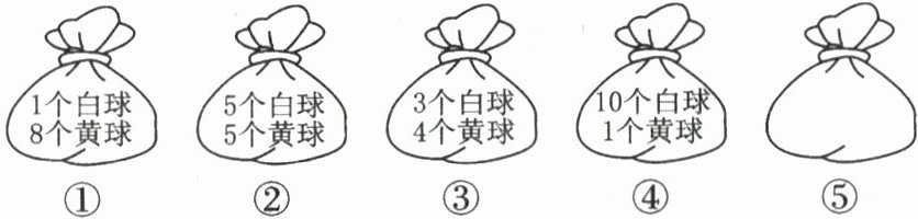 ①1个白球8个黄球 ②5个白球5个黄球 ③3个白球4个黄球 ④10个白球1个黄球 ⑤___