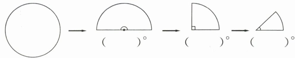 9. 把一张圆形纸片按下面的步骤对折,写出每次对折后得到的角的度数。