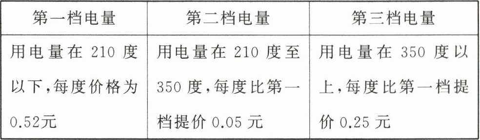 | 用电量在210度以下,每度价格为0.52元 | 用电量在210度至350度,每度比第一档提价0.05元 | 用电量在350度以上,每度比第一档提价0.25元 |