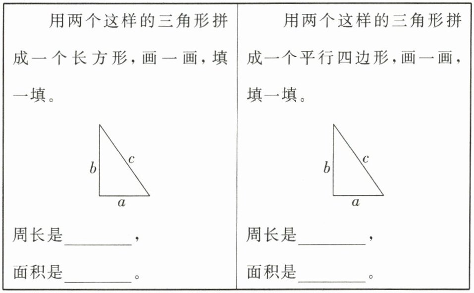 |用两个这样的三角形拼成一个长方形,画一画,填一填。|用两个这样的三角形拼成一个平行四边形,画一画,填一填。|