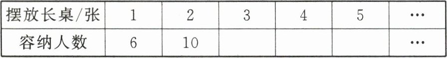 (1)由图可知,1 张长桌坐 6 人,2 张长桌坐 10 人,10 - 6 = 4,即每多摆 1 张长桌,能多坐 4 人。
