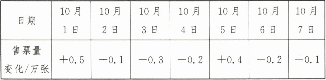 (2)解:10月3日售票量:1.7 - 0.3 = 1.4万张;10月4日售票量:1.4 - 0.2 = 1.2万张;10月5日售票量:1.2 + 0.4 = 1.6万张;10月6日售票量:1.6 - 0.2 = 1.4万张;10月7日售票量:1.4 + 0.1 = 1.5万张。因为1.5 > 1.1,所以10月7日售票量多。答:10月7日售票量多。