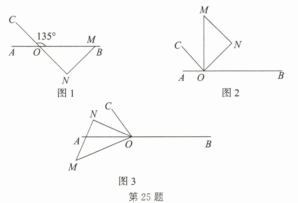25. 如图1,O为直线AB上一点,过点O作射线OC,使$\angle BOC= 135^\circ$,将一个含$45^\circ$角的直角三角板的一个顶点放在点O处,斜边OM与直线AB重合,另外两条直角边都在直线AB的下方.