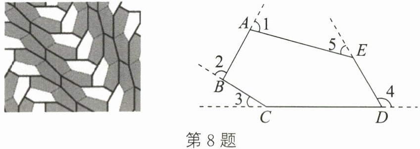 8. 完美五边形是指可以无重叠、无间隙铺满整个平面的凸五边形.如图,五边形ABCDE是迄今为止人类发现的第15种完美五边形的示意图,其中∠5= 35°,则∠1+∠2+∠3+∠4的度数为(