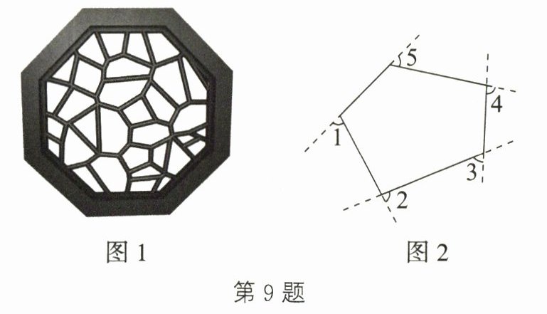 9. 图1是我国古代建筑中的一种窗格,其中冰裂纹图案象征着坚冰出现裂纹并开始融化,形状无一定规则,代表一种自然和谐美.图2是从图1冰裂纹窗格图案中提取的由五条线段组成的图形,则∠1+∠2+∠3+∠4+∠5= ______.