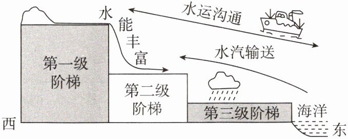 ①大河沟通东西交通,方便沿海和内地的联系 ②三级阶梯地势都很平坦,耕地资源都很丰富 ③有利于海洋湿润气流深入内陆,带来丰富的降水 ④阶梯交界处河流落差大,水能资源丰富