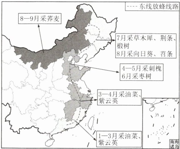 读某地蜂农东线放蜂线路示意图,回答第7、8题。