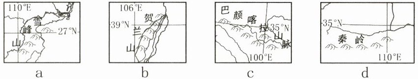 )①a图中的山脉是我国地势第二、三级阶梯的分界线 ②b图中的山脉是我国人口地理界线 ③c图中的山脉是我国1月0℃等温线经过的山脉 ④800毫米年降水量线大致经过d图中的山脉