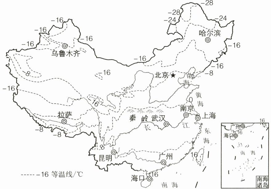 下图为中国某年1月平均气温分布示意图(单位:℃)。读图,回答第22、23题。