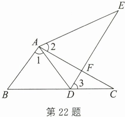 22. (本题满分10分)如图,点E在△ABC外部,点D在边BC上,DE交AC于点F,∠1= ∠2= ∠3,AB= AD.