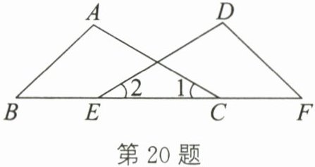 20. (本题满分8分)如图,点B,E,C,F在同一条直线上,BE= CF,∠A= ∠D,∠1= ∠2. 求证:AC= DE.