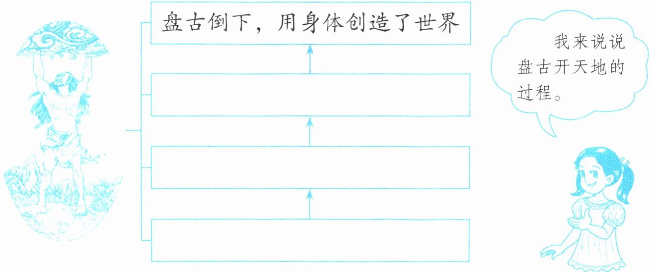 相传,巨人盘古劈开了(hēi hū hū □□□)的世界。轻而清的东西,缓缓(shàng shēng □□),变成了天;重而浊的东西,慢慢(xià jiàng □□),变成了地。盘古头顶天,脚踏地,撑了许多年,(jīng pí lì jié □□□□),累得倒下了。他用整个身体创造了美丽的世界。