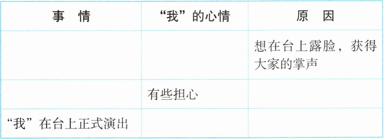 (2)①表现了“我”对演出既期待又紧张的心情。②表现了“我”演出时的紧张和狼狈。
