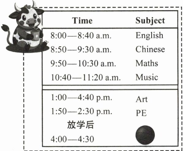 I have English from 8:00 to 8:40 a.m. Then I have Chinese from 8:50 to 9:30 a.m. After that, I have Maths from 9:50 to 10:30 a.m. And I have Music from 10:40 to 11:20 a.m.