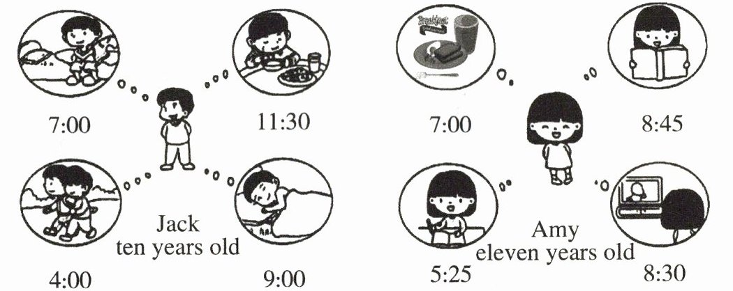 | I'm Jack. I'm ten. I get up at seven in the morning. I have lunch at eleven thirty every day. I usually go home at four o'clock. I go to bed at nine in the evening. | |