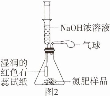 如图 2 所示,向盛有氮肥样品的锥形瓶中注入 $ NaOH $ 浓溶液。已知:铵盐与碱反应生成氨气,氨气溶于水得到氨水。