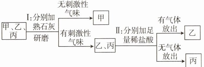 $\begin{matrix}& 甲、乙、丙 & \xrightarrow[研磨]{I:分别加熟石灰} & \begin{cases}无刺激性气味 & \xrightarrow{} & 甲 \\有刺激性气味 & \xrightarrow{} & 乙、丙\end{cases} \\& & \xrightarrow[II:分别加足量稀盐酸]{} & \begin{cases}有气体放出 & \xrightarrow{} & 乙 \\无气体放出 & \xrightarrow{} & 丙\end{cases}\end{matrix}$