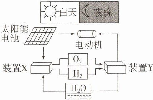 (2)写出该系统在白天工作时的能量转化过程:太阳能→电能→机械能,太阳能→电能→化学能$ '\mathrm{H}_{2}\mathrm{O}\xlongequal{通电}2\mathrm{H}_{2}\uparrow+\mathrm{O}_{2}\uparrow($至少写出2条)。装置X中的物质变化,用化学反应方程式表达为:。