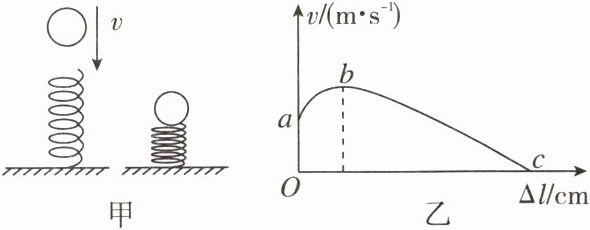 7. 如图甲所示,小球从某高度处由静止下落到竖直放置的轻弹簧上并压缩弹簧。从小球刚接触弹簧到将弹簧压缩到最短的过程中,小球的速度 v 和弹簧被压缩的长度 Δl 之间的关系如图乙所示,其中 b 点为曲线最高点。不计空气阻力,弹簧在整个过程中始终发生弹性形变,则小球(