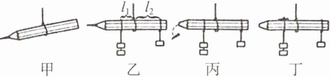 (3)在实验过程中,铅笔在水平位置平衡后(如图乙所示),小宁不小心将前端细长的铅笔芯弄断了(如图丙所示),他立即将铅笔握住,并将断笔芯放到左端细线下方固定好(如图丁所示),则松手后的铅笔