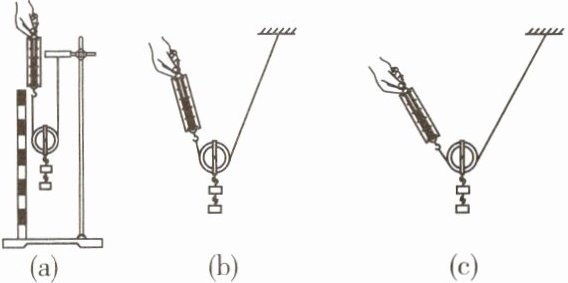 甲小组按照实验要求在滑轮上挂上钩码,竖直向上拉弹簧测力计,每次都匀速提起钩码,如图(a)所示。乙、丙两个小组的同学实验时,没有按照要求规范操作,他们斜向上拉弹簧测力计,匀速提起钩码,实验情况分别如图(b)(c)所示。