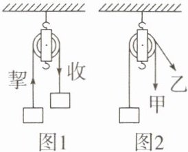 7. 《墨经》将提举重物的力称为“挈”,将往下降落的力称为“收”,将整个滑轮称为“绳制”(图1)。现分别用甲、乙两个力替代“收”(图2),使重物在相同的时间内匀速上升相同高度。不计绳重和摩擦,下列说法正确的是(