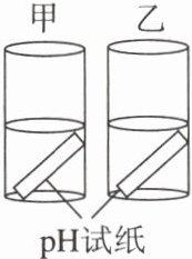 4. 如图所示,甲、乙两只玻璃杯中分别盛有两种水样,向两种水样中分别浸入 pH 试纸,甲玻璃杯中 pH 试纸呈现淡橘黄色(弱酸性),乙玻璃杯中 pH 试纸呈现淡绿色(弱碱性)。请回答下列问题。
