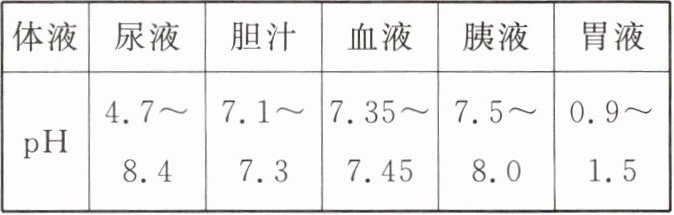 1. 下表为人体不同器官内部分体液的 pH 范围。下列有关说法不正确的是(