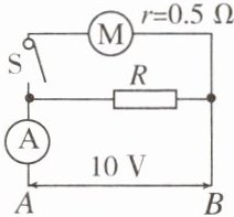 5. 如图所示,A、B两端电压为10V,电动机M的线圈电阻为0.5Ω。当S断开时,电流表示数为1A;当S闭合时,电流表示数为3A。则: