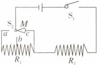 2. 电热靴的电路图如图所示,电源电压恒定,$S_{2}$为三挡旋钮开关(金属片M可分别拨至a、b、c处),电阻丝$R_{1}$、$R_{2}$规格相同且阻值不变,b为电阻丝$R_{1}$的中点。该电热靴的低温挡功率为6W,则其中温挡功率和高温挡功率分别为(