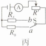 (6)小刚同学又设计了一种测量定值电阻 $ R_x $ 阻值的实验电路方案,如图丙所示,方案中已接入一个阻值为 $ R_0 $ 的定值电阻。电路中 $ R_x \neq R_0 $,将 S 接到 a,读出电流表的示数 $ I_1 $;再将 S 接到 b,读出电流表的示数 $ I_2 $,由 $ I_1 R_0 = I_2 R_x $ 可得 $ R_x = \frac{I_1 R_0}{I_2} $。请判断结果是否正确,并简要说明理由: