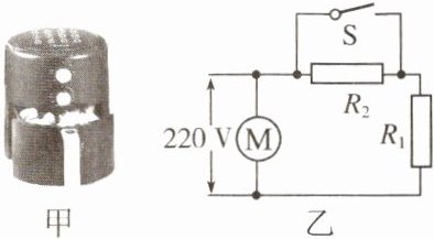 4. 小明家新买了一台空气炸锅,如图甲所示,它主要由电动机带动的电风扇和电热丝组成。这个空气炸锅有两个挡,图乙是它的电路图,技术参数如表所示。工作时电热丝将空气加热,利用高温空气来代替食用油,通过高功率的风扇,使高温空气在一个密闭空间内形成循环热流,通过热流使食物迅速变熟(不考虑温度对电阻的影响)。