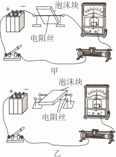 6. 为研究电流通过导体产生的热量与哪些因素有关,某同学找来了两根不同阻值的电阻丝、多块相同的泡沫块以及滑动变阻器、开关、导线、电源等,设计的方案如图甲所示。