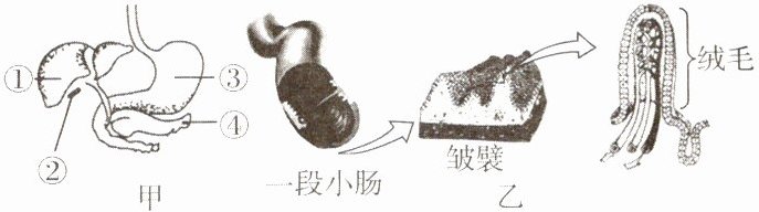 (3)消化后的营养成分主要在图甲中的[7]处被吸收,这里的内表面有许多环形的皱襞和小肠绒毛,适于营养物质的吸收。