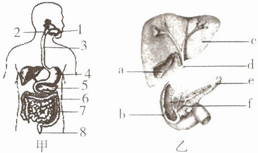 (1)消化食物的主要器官是图甲中的[ ],因为它里面有图乙中[e]胰腺分泌的胰液、[c]肝脏分泌的胆汁以及其自身腺体分泌的肠液等多种消化液。