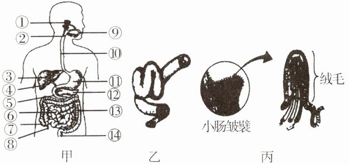10. 图甲为人体消化系统的模式图,图乙和图丙是人体消化道某部位的结构图,请据图回答下列问题。